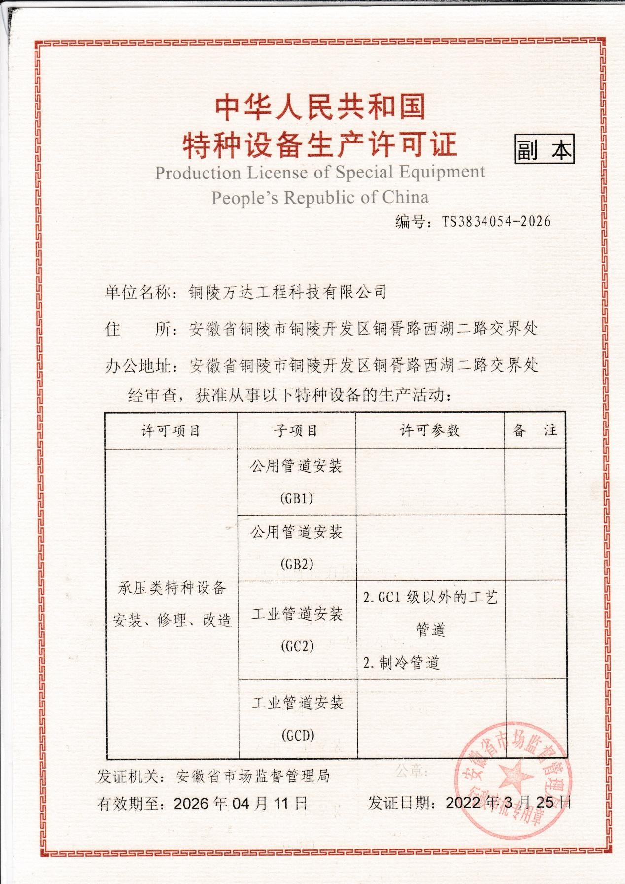 公用管道設備生產(chǎn)許可證